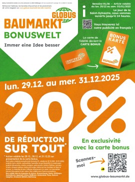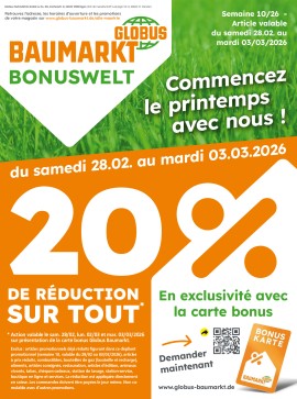 Retrouvez toutes les semaines les dernières offres et bons plans de Globus Baumarkt. Vos deux magasins de bricolage, à Bettembourg et à Junglister, vous accueillent du Lundi au Samedi pour vous proposer une large gamme de produit pour qu'il vous faut pour vos projets, des grands travaux ou des petits bricolages. Retrouvez tous les matériaux de construction nécessaires, d'outillage et les accessoires pour embellir votre maison ou votre appartement. Retrouvez ce dont vous avez besoin, pour repeindre vos murs ou pour poser un nouveau papier peint, Globus Baumarkt et ses collaborateurs en magasin seront ravis de vous accueillir. Profitez des offres disponibles chaque semaine et les nombreux articles en promotions sur Biscuit.